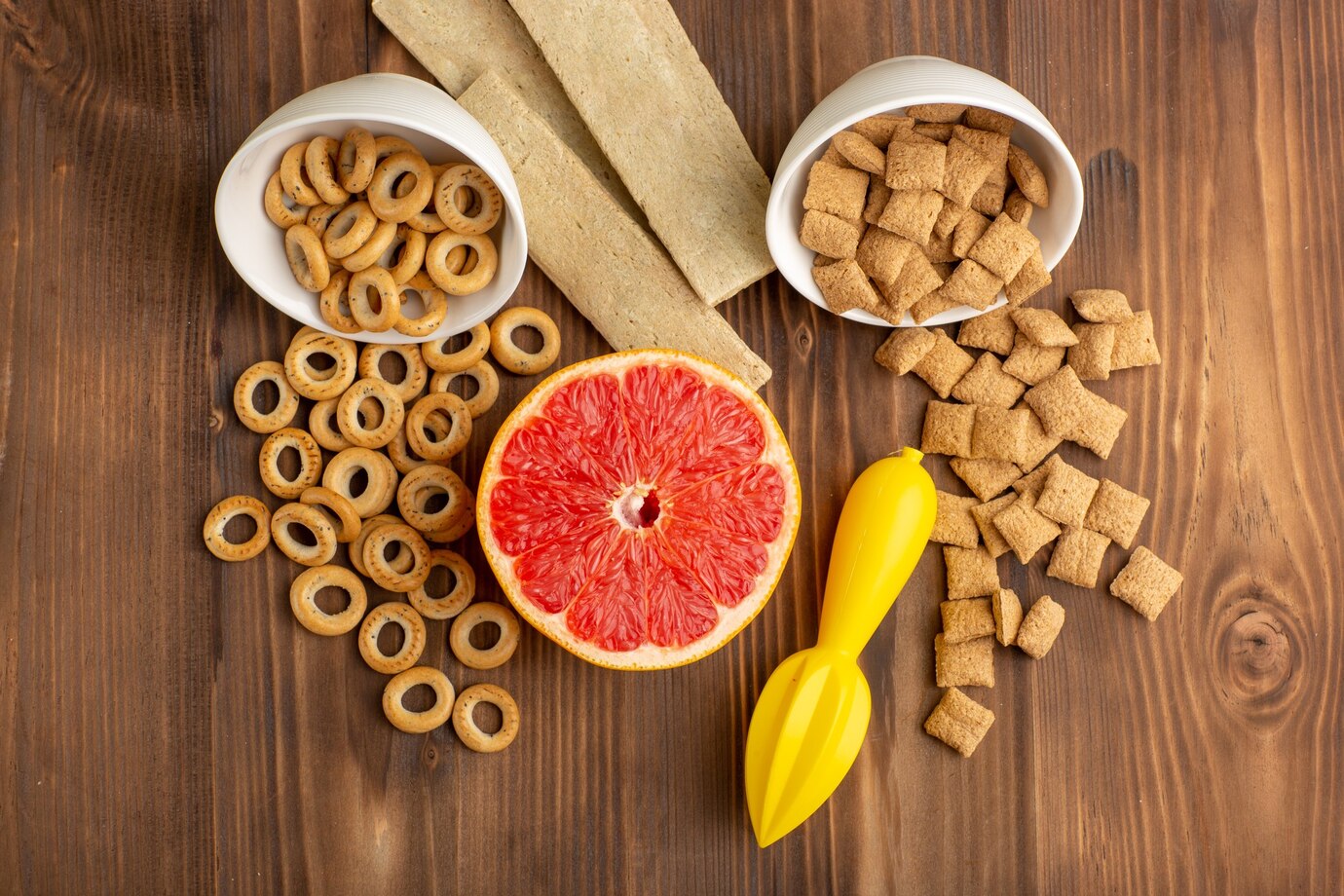 top view little cookies crackers with grapefruit brown wooden desk 140725 66051